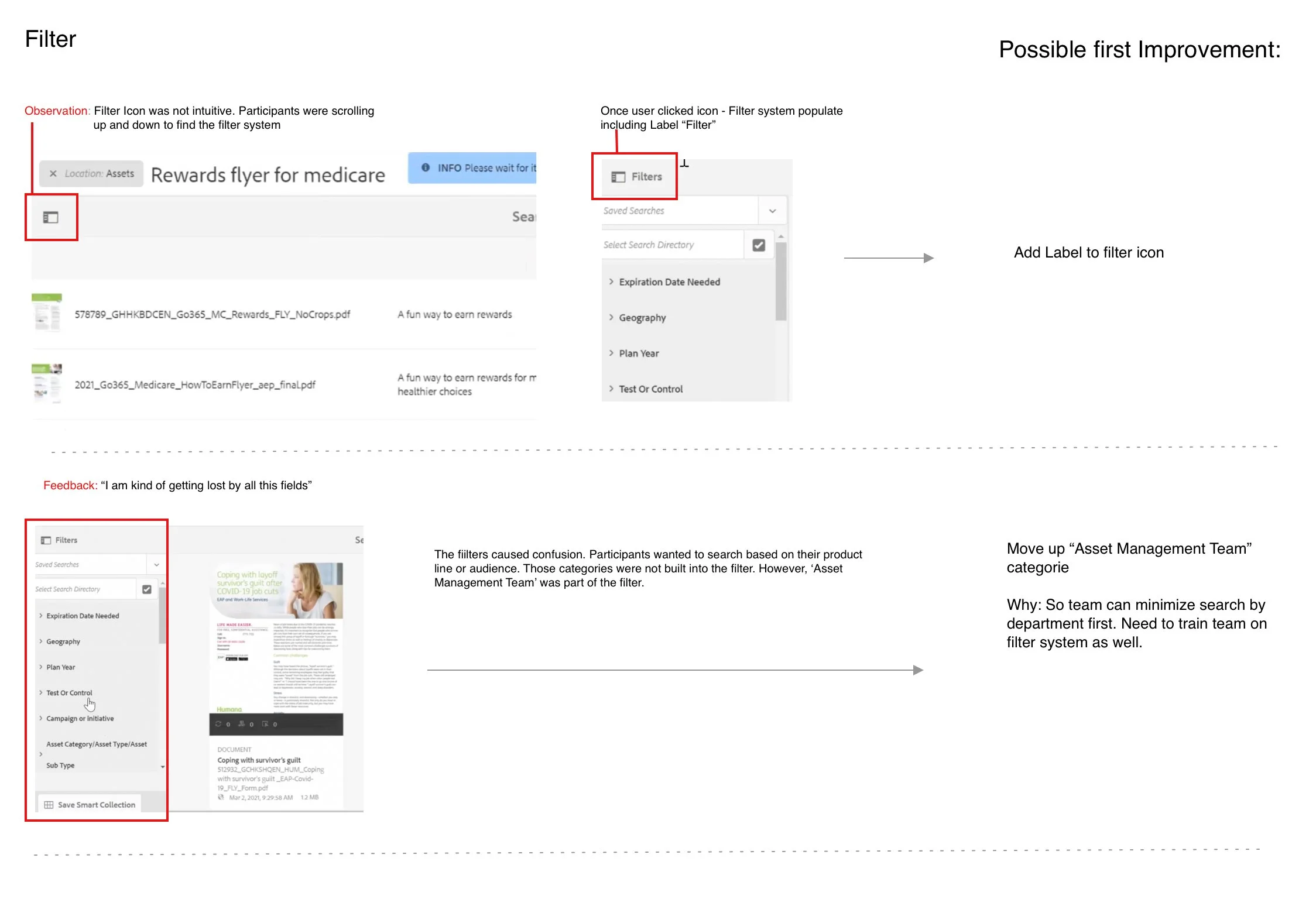 Why: While I was working with the team on taxonomy, the different departments within Humana started to have monthly meetings to discuss improvements in the DAM, which was being build out. I started to conduct Usability Testings with some team members from Wellness to discover areas for improvements in AEM Assets, which were presented to stakeholders.