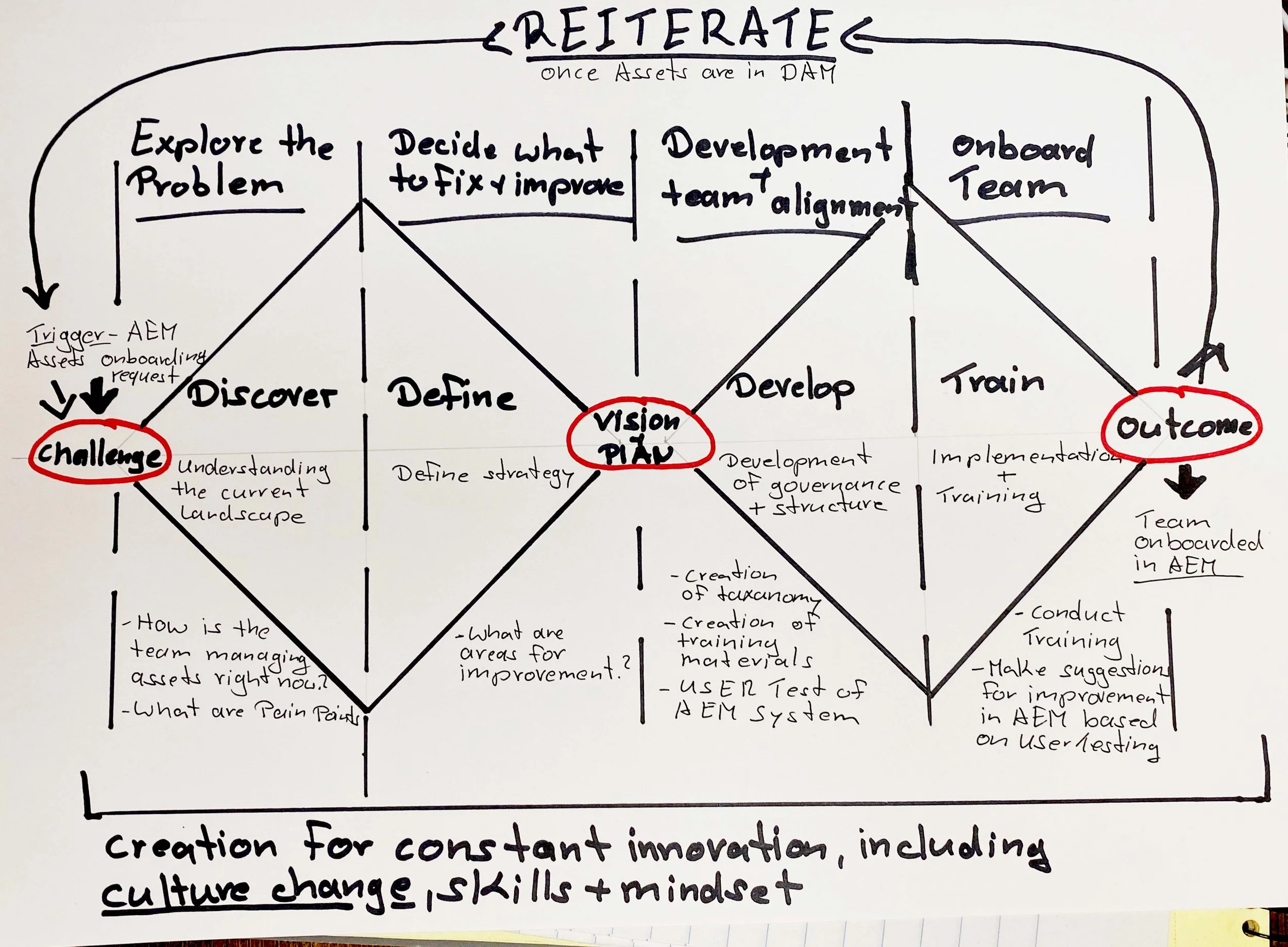 The strategy I developed is shown in the Double Diamond method. First I tried to understand, with the help of the team, how assets are managed currently. Through team meetings and 1:1 interviews with team members I discovered frustrations and struggles they had when it comes to asset management and developed a list of possible improvements. The team and I set out to develop a taxonomy and standards before I started training them and onboard them to AEM Assets.