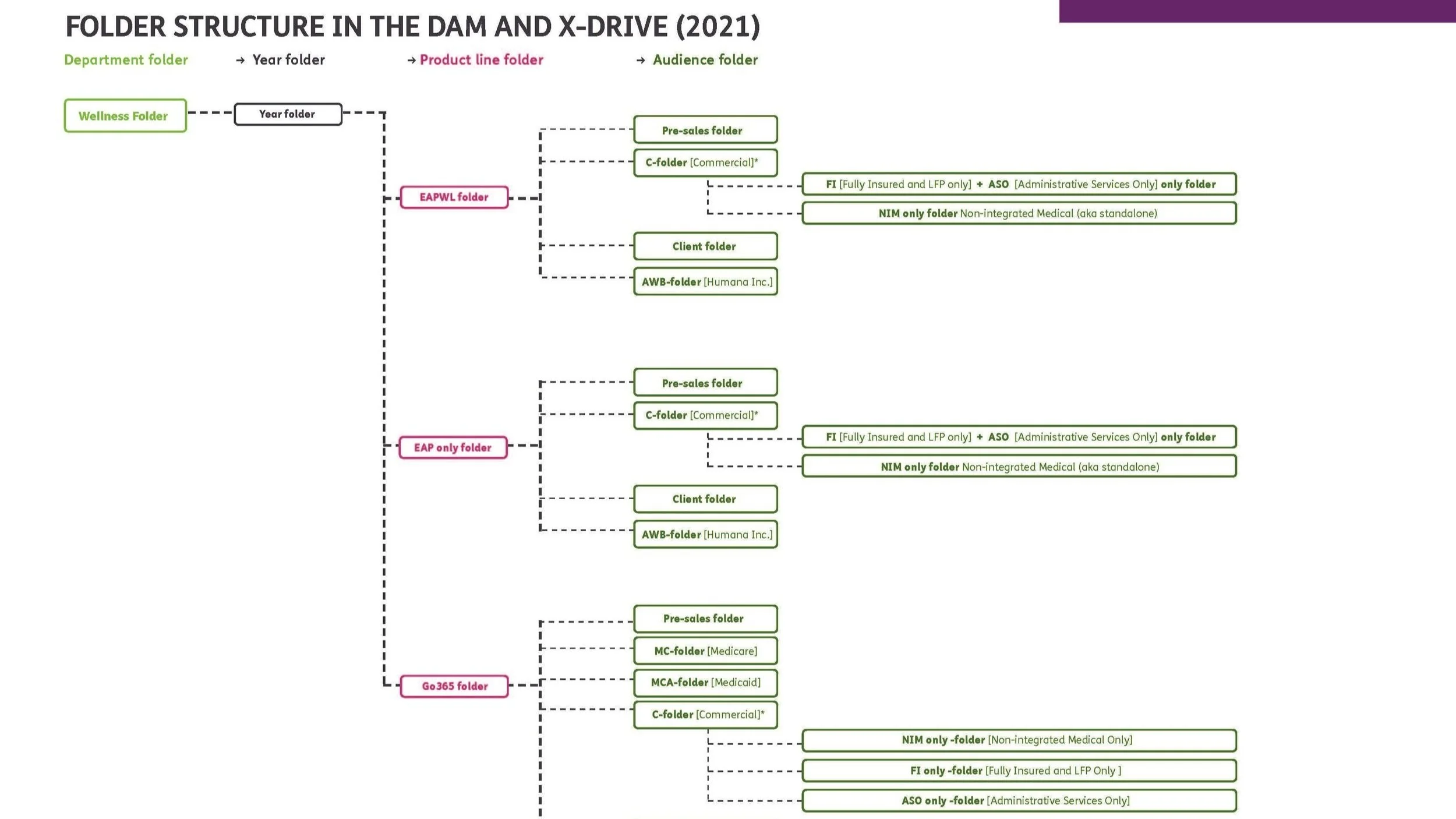 To understand how other departments were preparing for AEM, I reached out to the Corporate Marketing and IT teams. While a foundational metadata structure had been established, it did not meet the specific search and organizational needs of the Wellness team. I began collaborating with the broader DAM group to ensure our taxonomy aligned but also expanded where necessary.