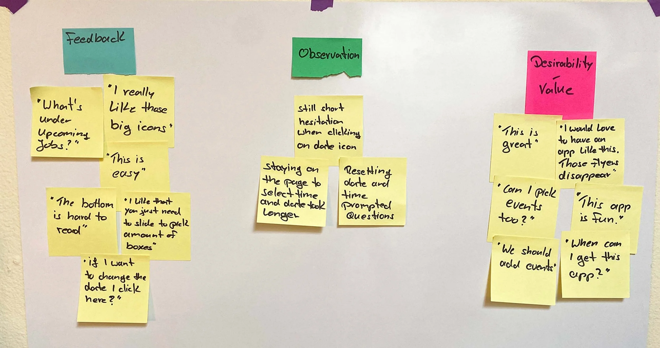 I conducted tests with 7 people (5 male, 2 female) between 65 and 72 years old. The feedback was positive. The page where one needs to select time and date and the reset of that needs some rework. Participants were excited about the app, since the flyers on the church board happen to disappear in case someone needs anything. Adding events was a big ask, since they wanted to be informed when an event is happening (that brings us back to the research findings - seniors like to stay active and be engaged with their communities).